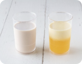 カゼインは、普段はとても小さなかたまりとして、牛乳の中でお互いに反発しており、ふわふわと浮いています。磁石のマイナスとマイナスが反発するイメージです。そこに、果汁100%ジュースのように酸性の物をいれると、マイナスとプラスのバランスが変わって、反発しあっていたカゼインが引き合うようになり、カゼインが大きなかたまりとなります。かたまりが大きくなると均一に散らばることができず、水分と分離してしまい、今回のような白い層ができます。
