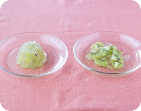 ゼラチン(「ゼライス」)はタンパク質である豚のコラーゲンから作られています。そして、今回ゼリーに使用したキウイには、タンパク質を分解する成分(タンパク質分解酵素)が含まれています。ゼラチンを溶かした液体の中にキウイを入れると、キウイの成分がゼラチンを分解し、固める力を弱めてしまいます。そのため、型から出すと形を保てない程のやわらかいゼリーになります。
