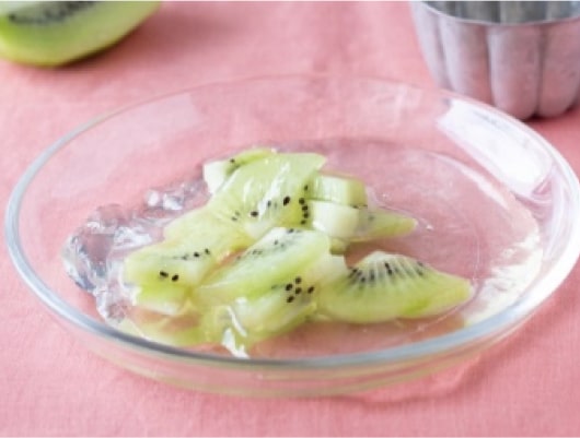 一方、寒天(「かんてん」)は海藻から取り出した食物繊維でできており、タンパク質ではないので、キウイのタンパク質を分解する成分の影響を受けることはなく固めることができます。