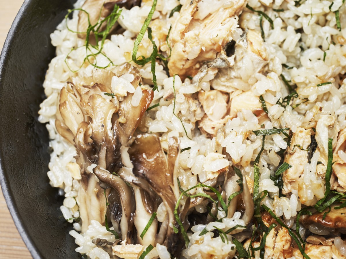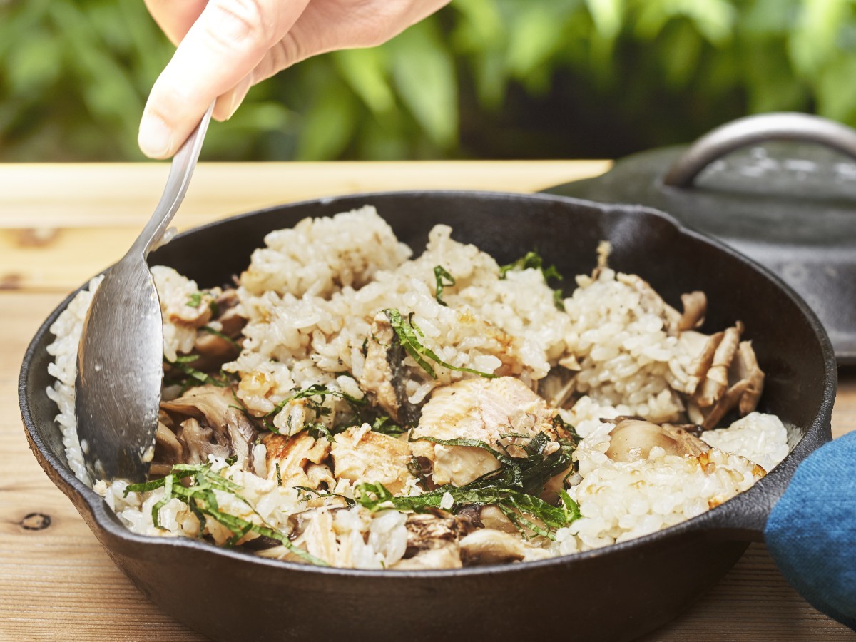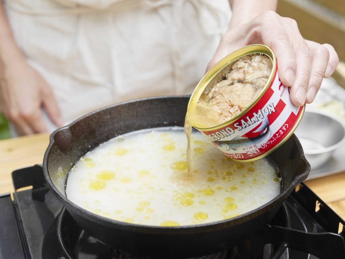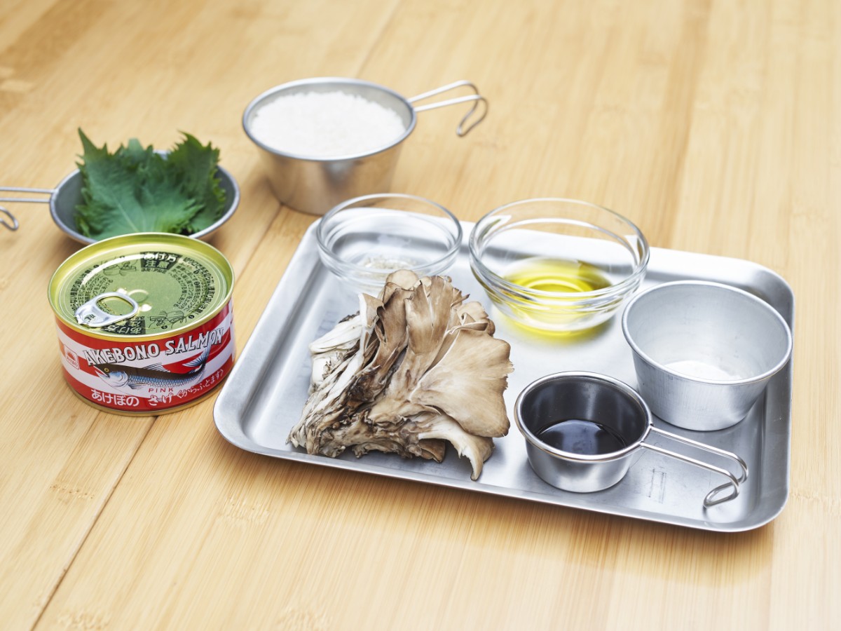 今回教えていただいたのは、「あけぼのさけ」を使ったモダンな炊き込みご飯。サケ缶汁ときのことオリーブオイルを加えて炊き込むことで、まろやかな旨みが米の一粒一粒に行き渡り、ご馳走感たっぷり。