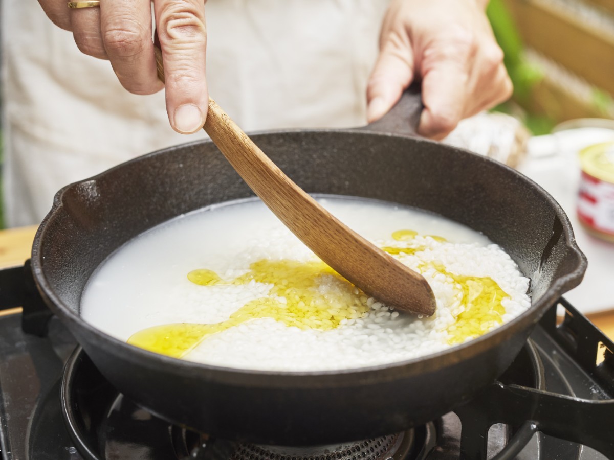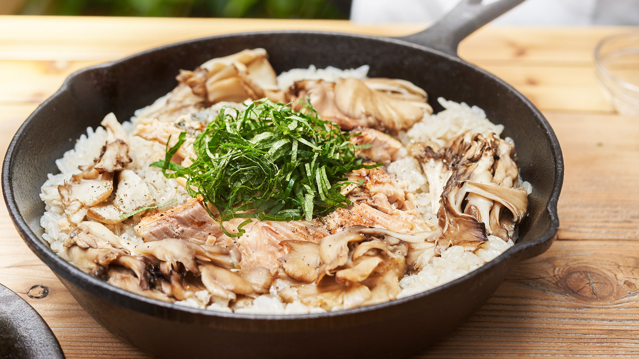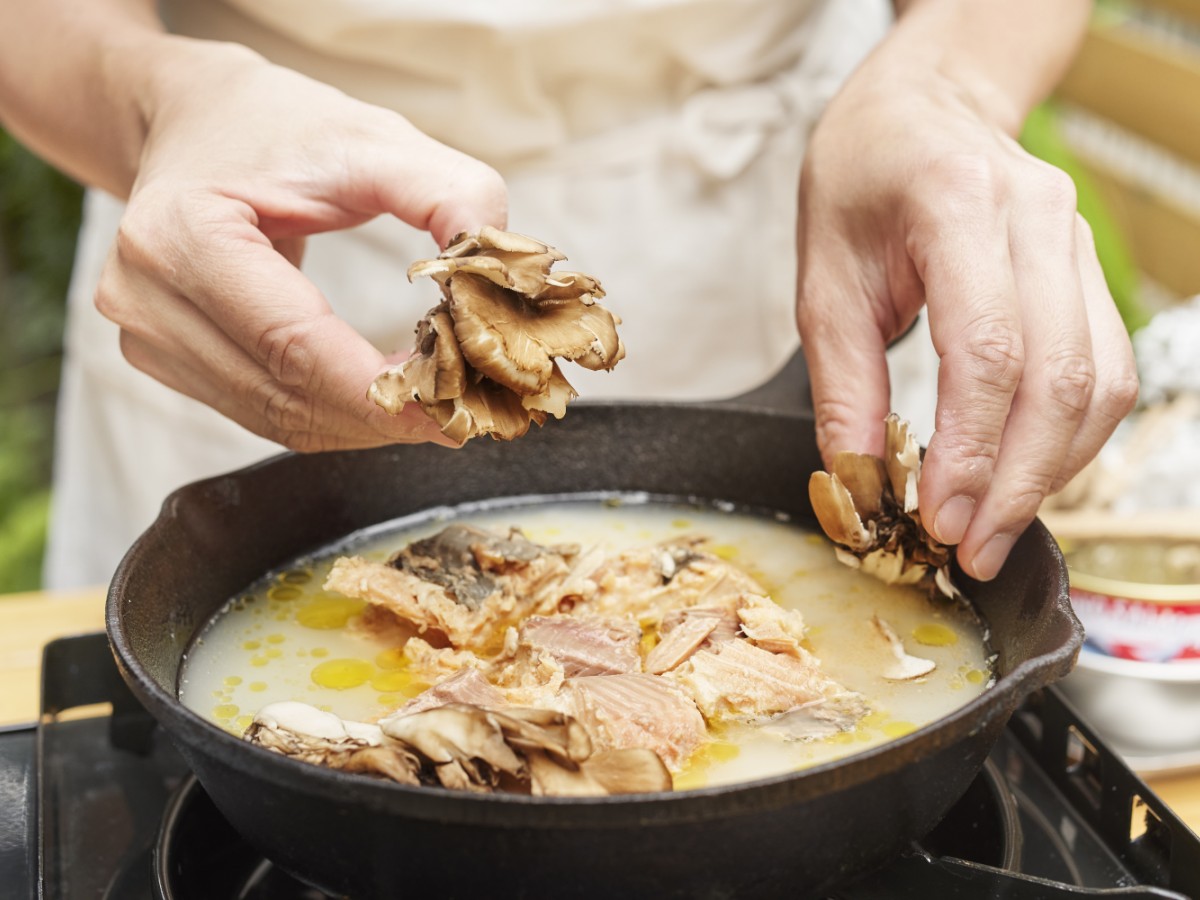 今回教えていただいたのは、「あけぼのさけ」を使ったモダンな炊き込みご飯。サケ缶汁ときのことオリーブオイルを加えて炊き込むことで、まろやかな旨みが米の一粒一粒に行き渡り、ご馳走感たっぷり。
