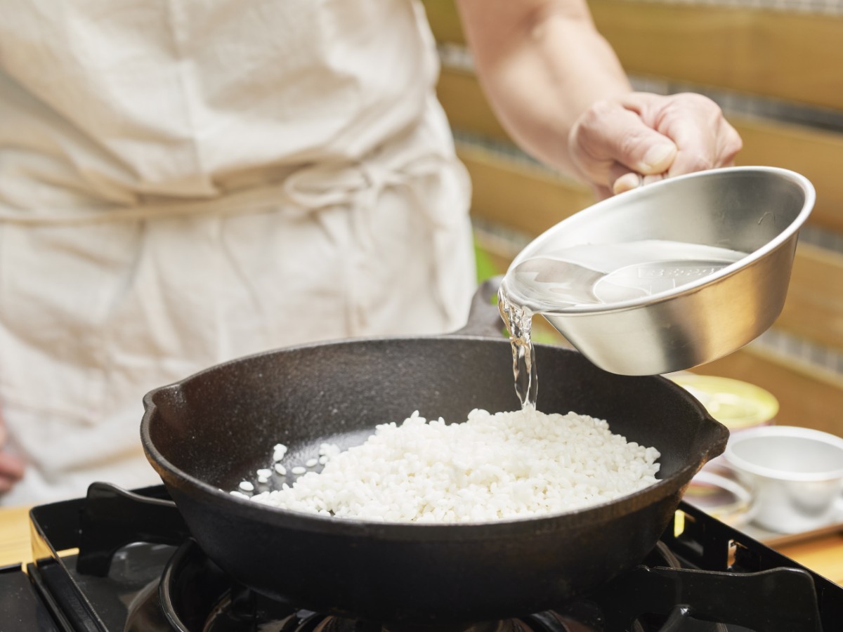 【1】あらかじめ浸水しておいた米に分量の水を加える。
