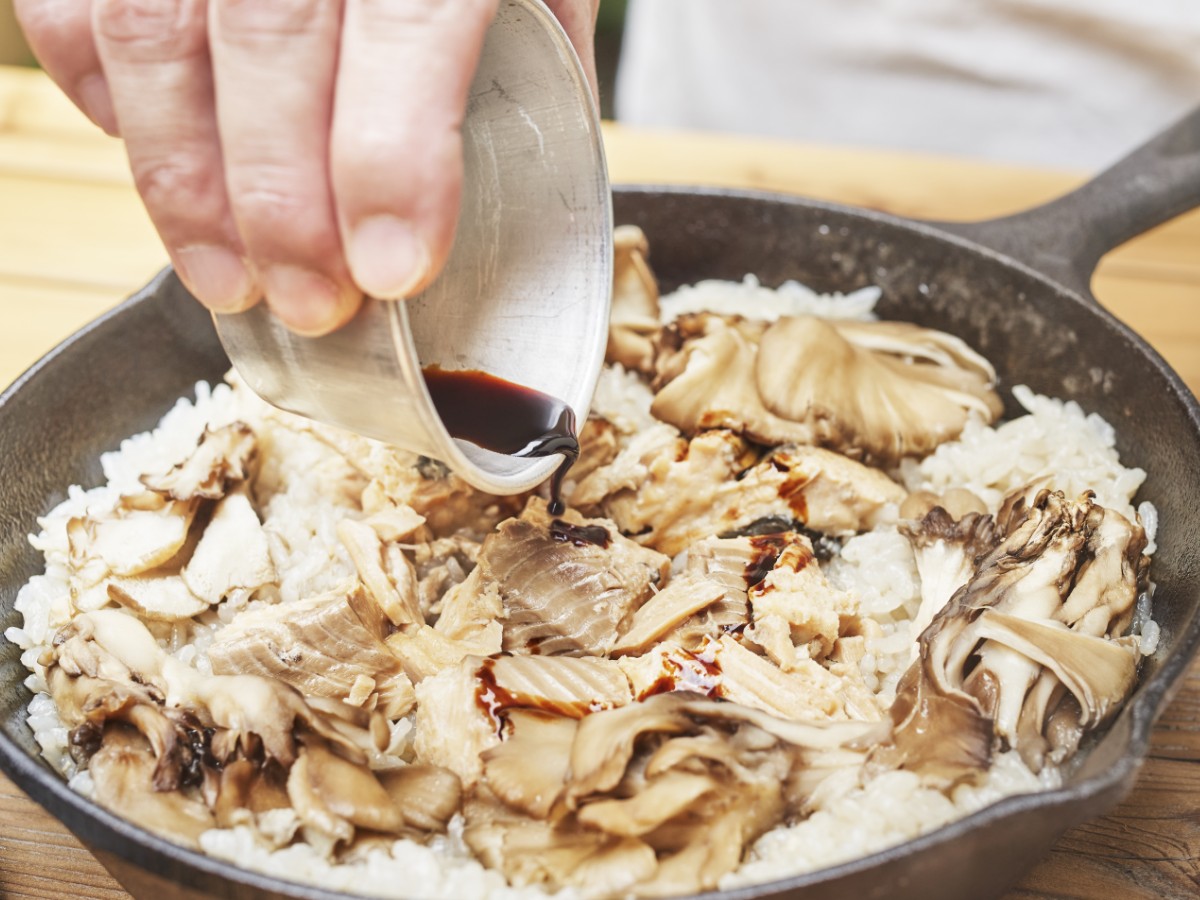 醤油は香りが飛ぶので炊き上がってからかける。味のムラもアクセントに。